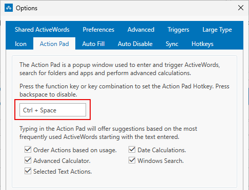 Options → ActionPad tab – Use this tab for the ActionPad hotkey (default: Ctrl+Space). In V5, the ActionPad hotkey is configured in one place only to avoid confusion.