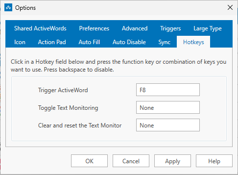To set a hotkey, simply press the key combination you want on your keyboard. ActiveWords captures it and assigns it. No need to type or select from a list.